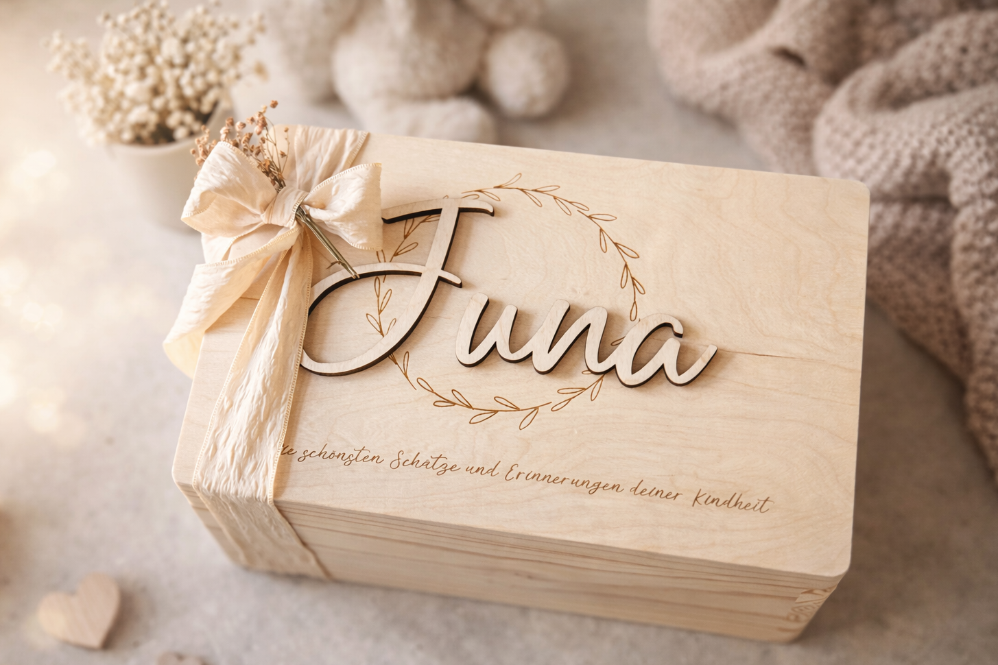 Handgefertigte Erinnerungsboxen aus Holz – personalisiert für besondere Momente.