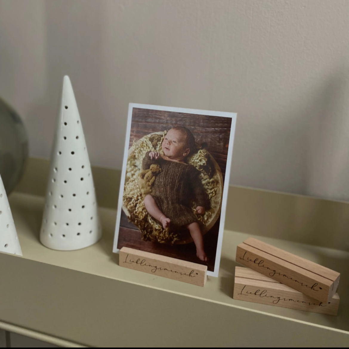 Mit unserem Fotohalter mit Wunschgravur und einem kleinen Herz aus Buchenholz kannst du deine Bilder ganz einfach und stilvoll in deinen Räumen integrieren und bringst eine persönliche Note in deIne Dekoration. Es ist eine ganz bezaubernde Geschenkidee für viele Anlässe, ob zum Muttertag, Vatertag, Geburtstag, Weihnachten oder als Geschenkidee für Oma oder Opa.