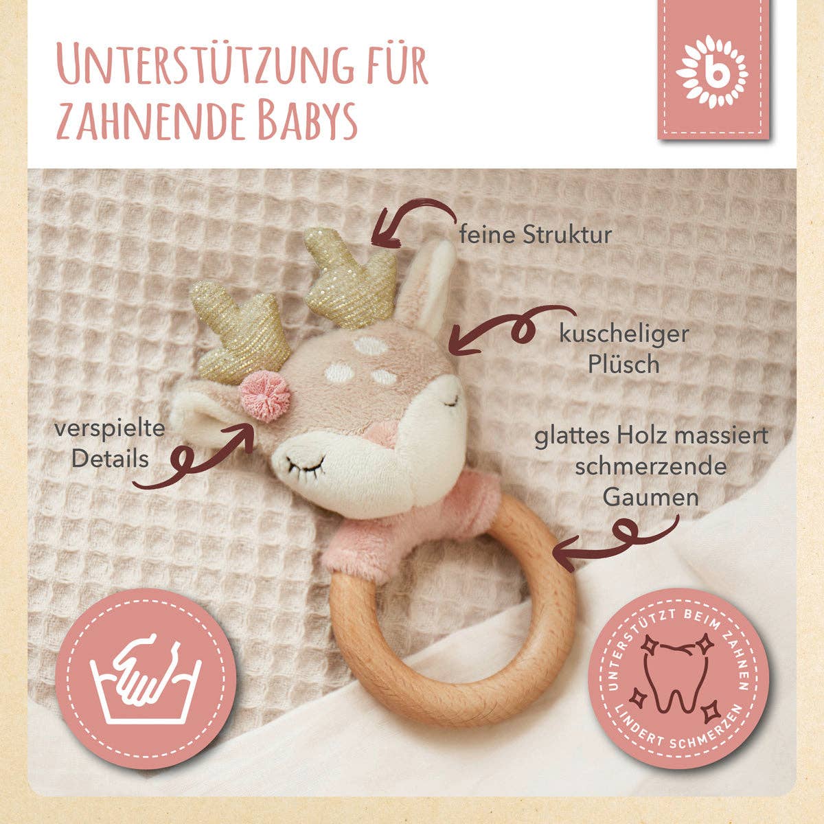 Der Plüsch-Greifling Reh mit Rassel von Bieco ist ein tolles Spielzeug für den kleinen Neuankömmling und zeigt sich in zauberhaft niedlicher Gestalt. Das Reh ist Greifling, Rassel und Beißring in einem und somit ein treuer Begleiter in den ersten Lebensmonaten deines Babys. Das natürliche Holz und das weiche Plüsch fühlen sich schön in den Händen deines Kindes an und sind zeitgleich spannender Kontrast zur Anregung des Tastsinnes. Als Zahnungshilfe stärkt der Holzring den Gaumen deines Babys und hilft den Zahnungsschmerz zu lindern. Wird das Reh geschüttelt, rasselt es fröhlich und fördert so spielerisch Feinmotorik und den Gehörsinn deines Kindes.