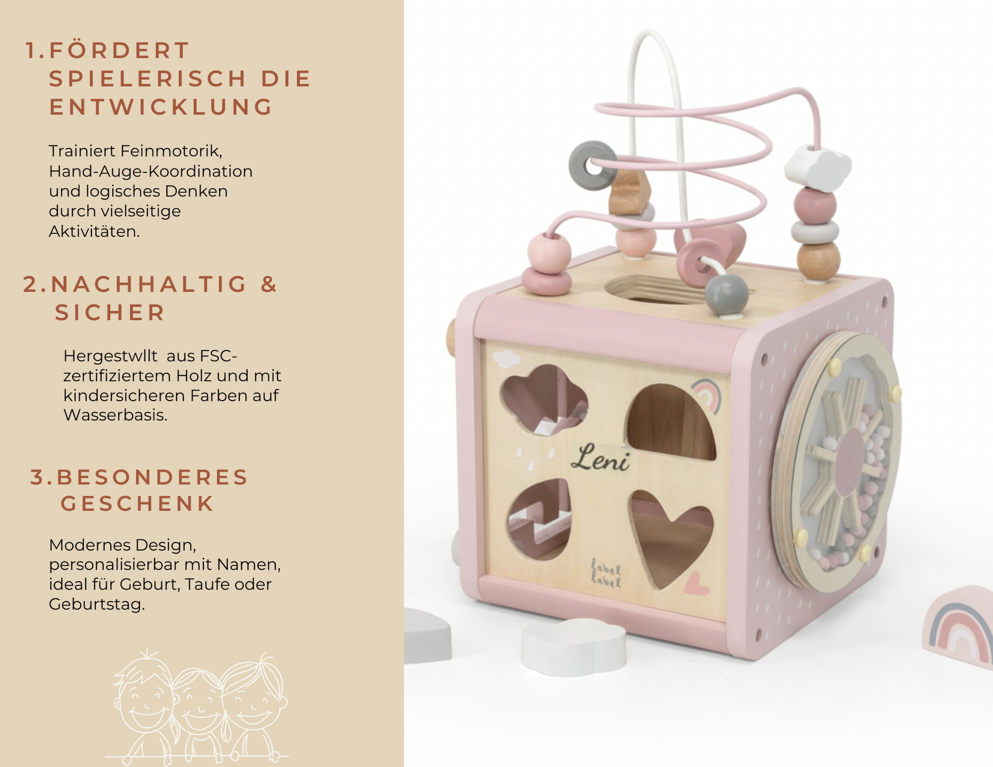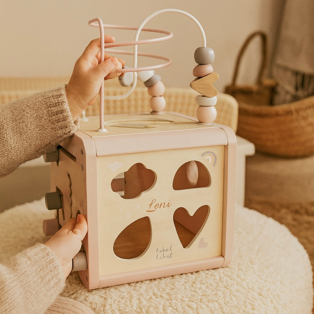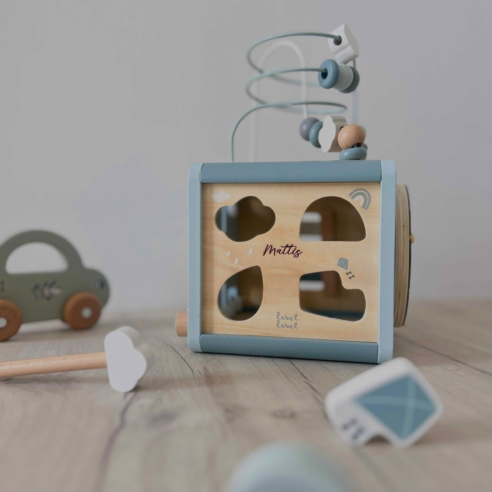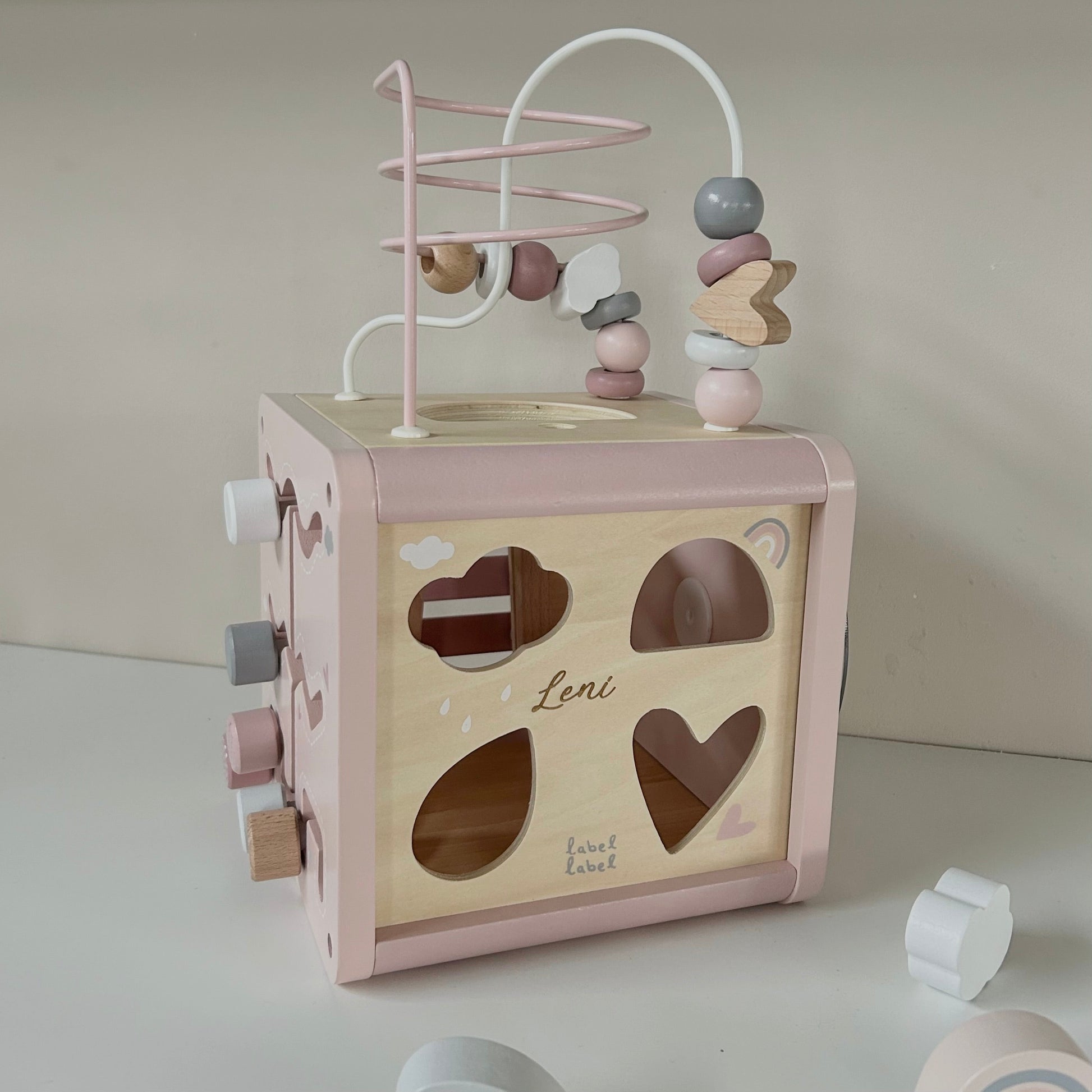 Der Motorikwürfel „Label Label“ ist nicht nur ein Spielzeug, sondern ein pädagogisch wertvolles Lernspielzeug, das Kinder zur Entdeckung der Welt anregt. Die sanften Farbvarianten passen perfekt in jedes Kinderzimmer und machen den Würfel zu einem stilvollen Hingucker.