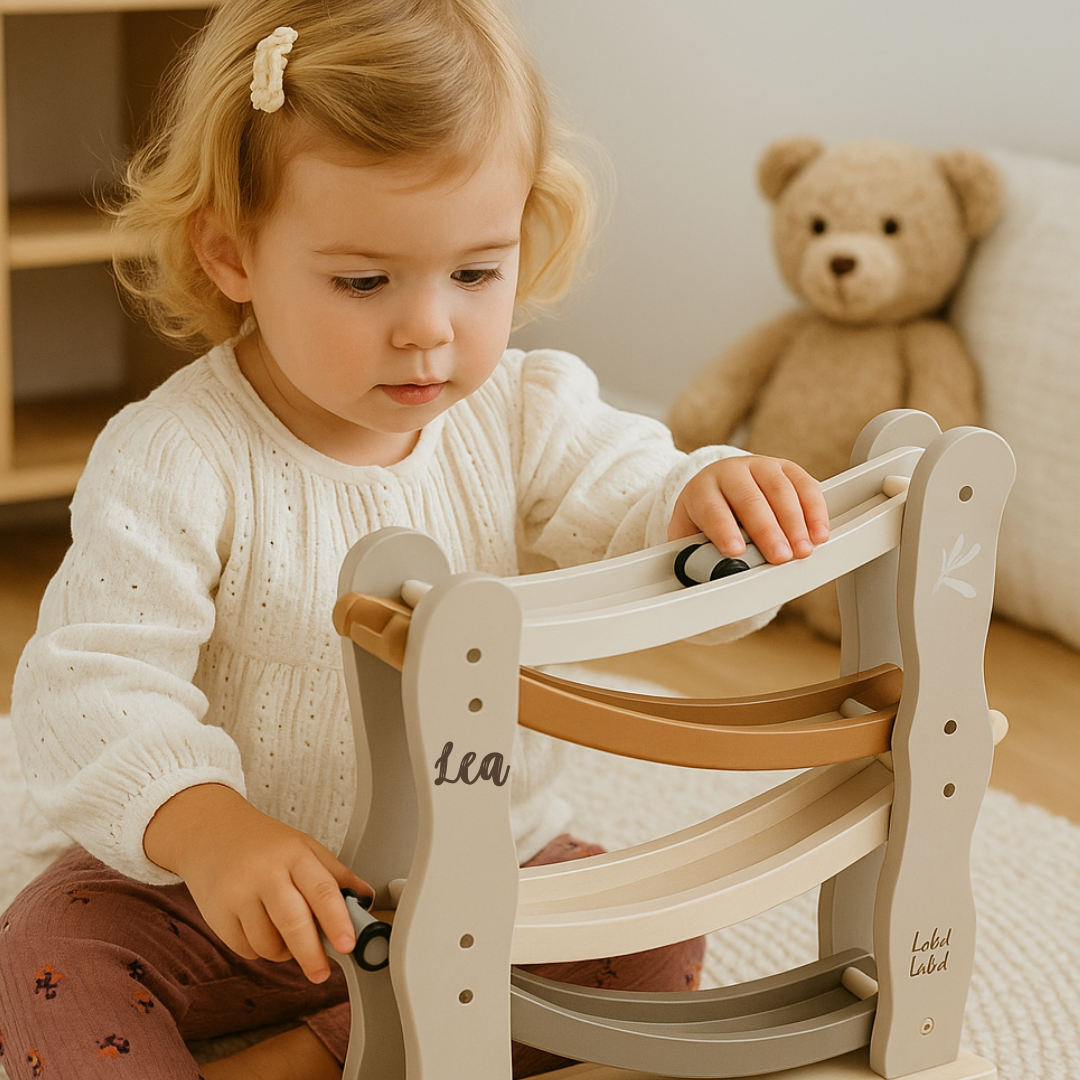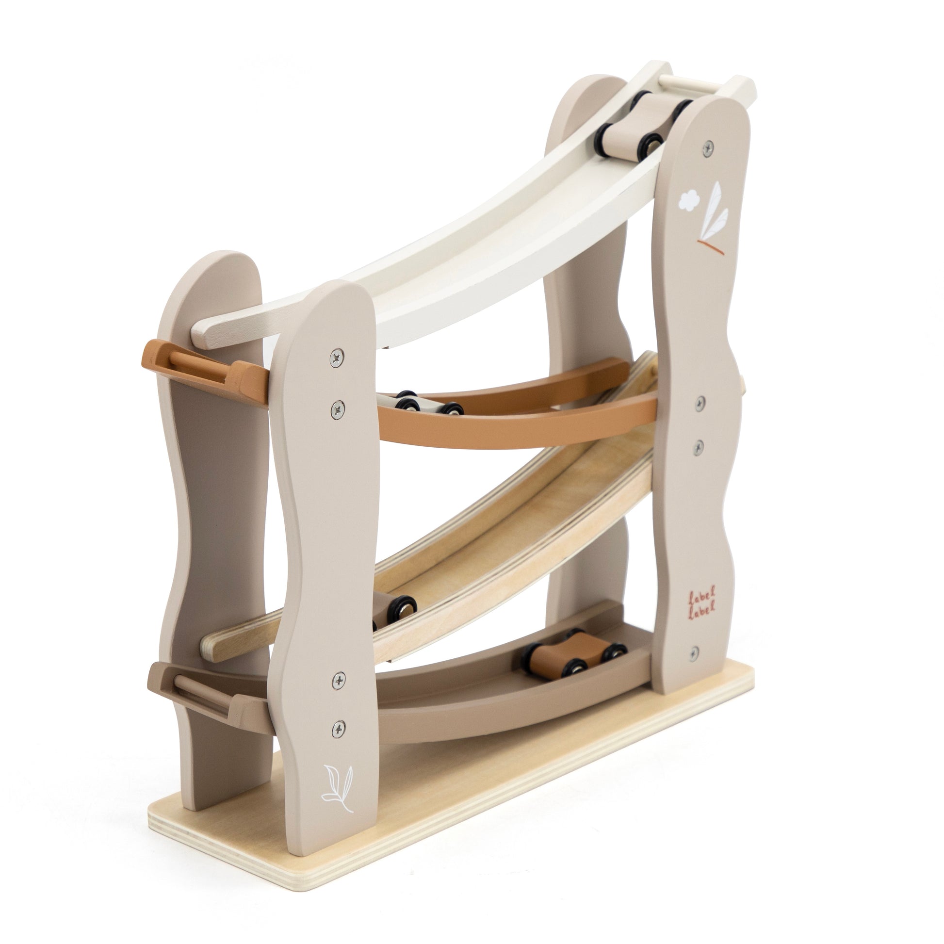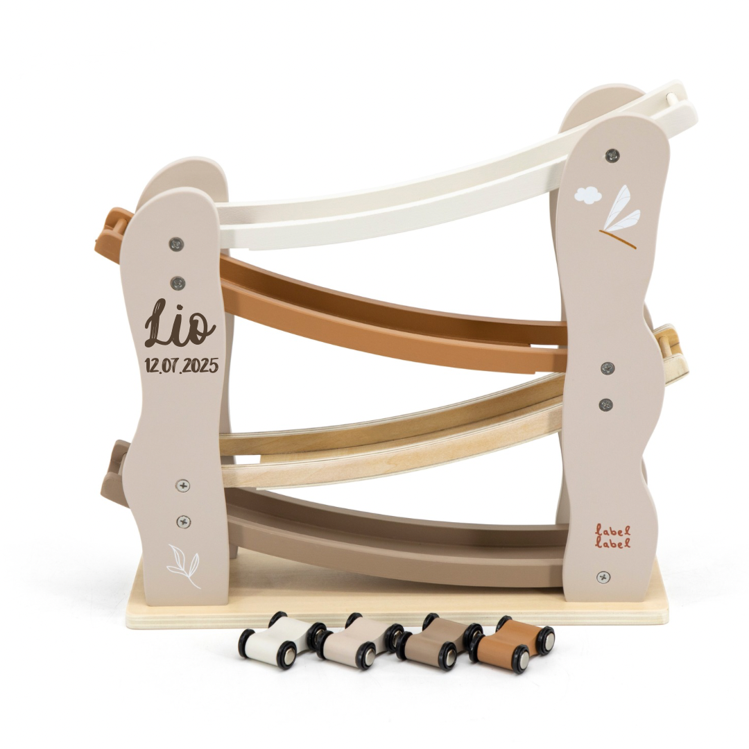 Der liebevoll designte Label Label Car Slider in zarten Beige- und Nougattönen ist das perfekte Holzspielzeug für Babys und Kleinkinder. Die kleinen Holzautos flitzen Stufe für Stufe die Rampe hinunter – ein magischer Moment, der immer wieder begeistert und gleichzeitig Motorik, Konzentration und Hand-Augen-Koordination spielerisch fördert.
