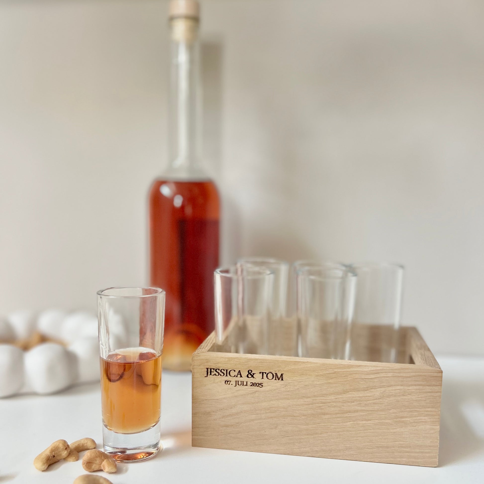 Personalisiertes Schnapstablett aus Eichenholz – mit Gravur & 6 Gläsern