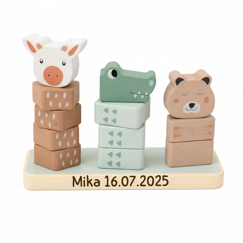 Das Highlight: Wir gravieren den Stapelturm individuell mit Wunschname und Datum (z. B. Geburtsdatum oder Taufdatum). So wird aus einem Spielzeug ein persönliches Geschenk, das Kinderaugen strahlen lässt und auch später noch eine liebevolle Erinnerung bleibt.