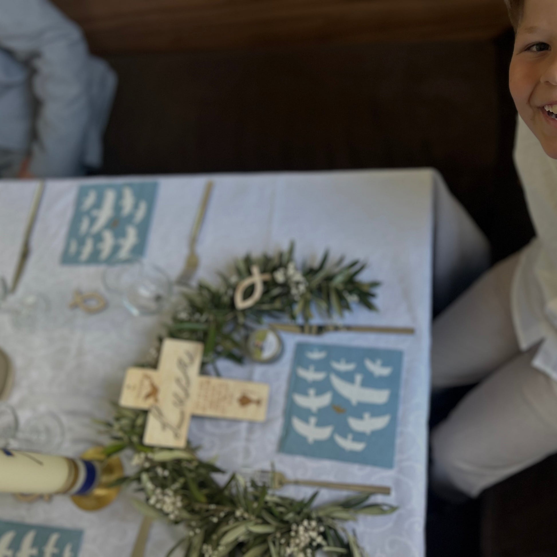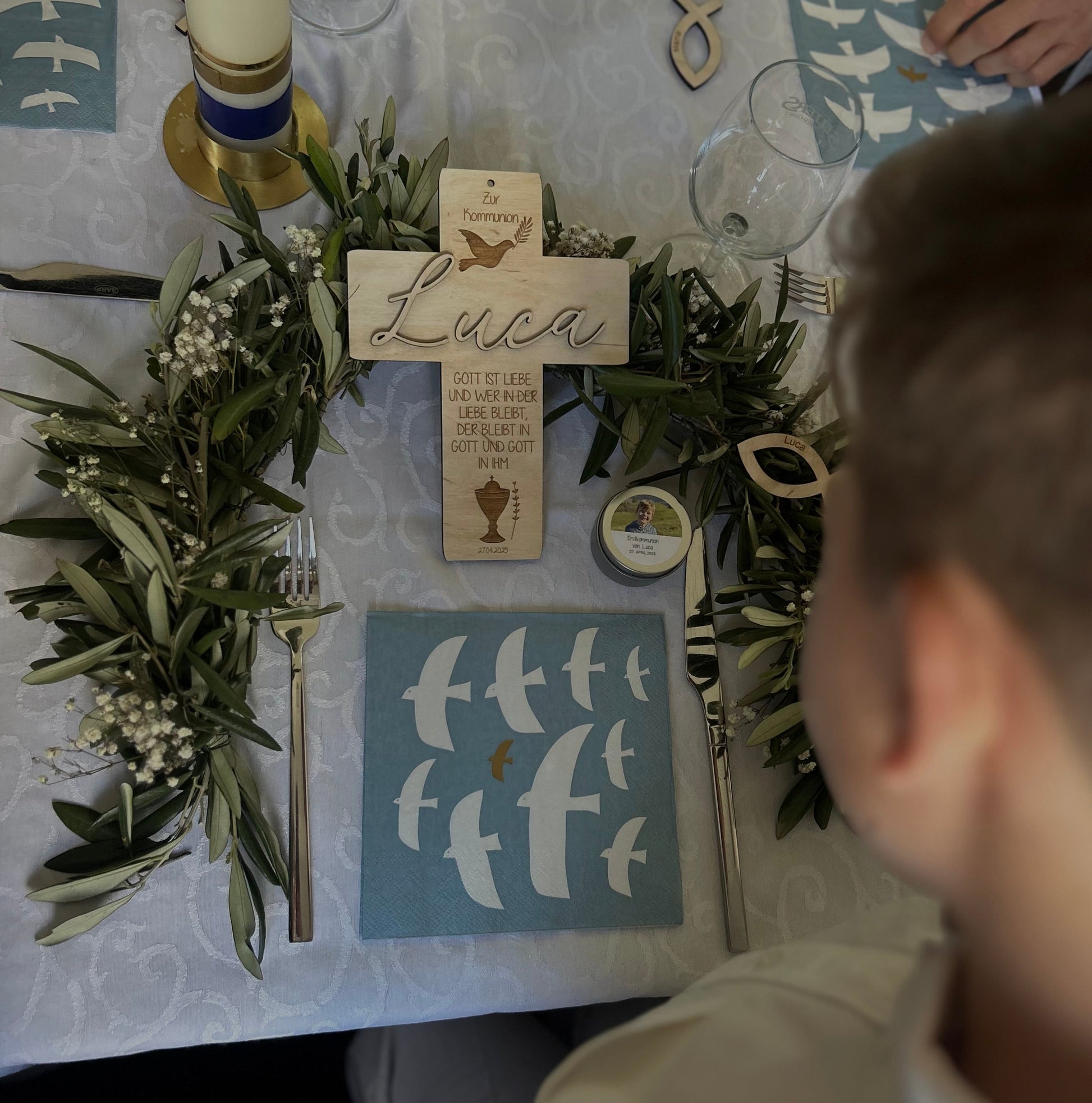 Die Kommunion ist ein wichtiger Schritt im Leben eines Kindes und wird meist feierlich in der Kirche begangen. Anschließend wird dieser besondere Anlass häufig gemeinsam mit Familie, Paten, Verwandten und Freunden gefeiert. Mit diesem liebevoll gestalteten Kommunionskreuz schenkst du nicht nur ein dekoratives Highlight, sondern ein Symbol, das diesen Tag für immer festhält.