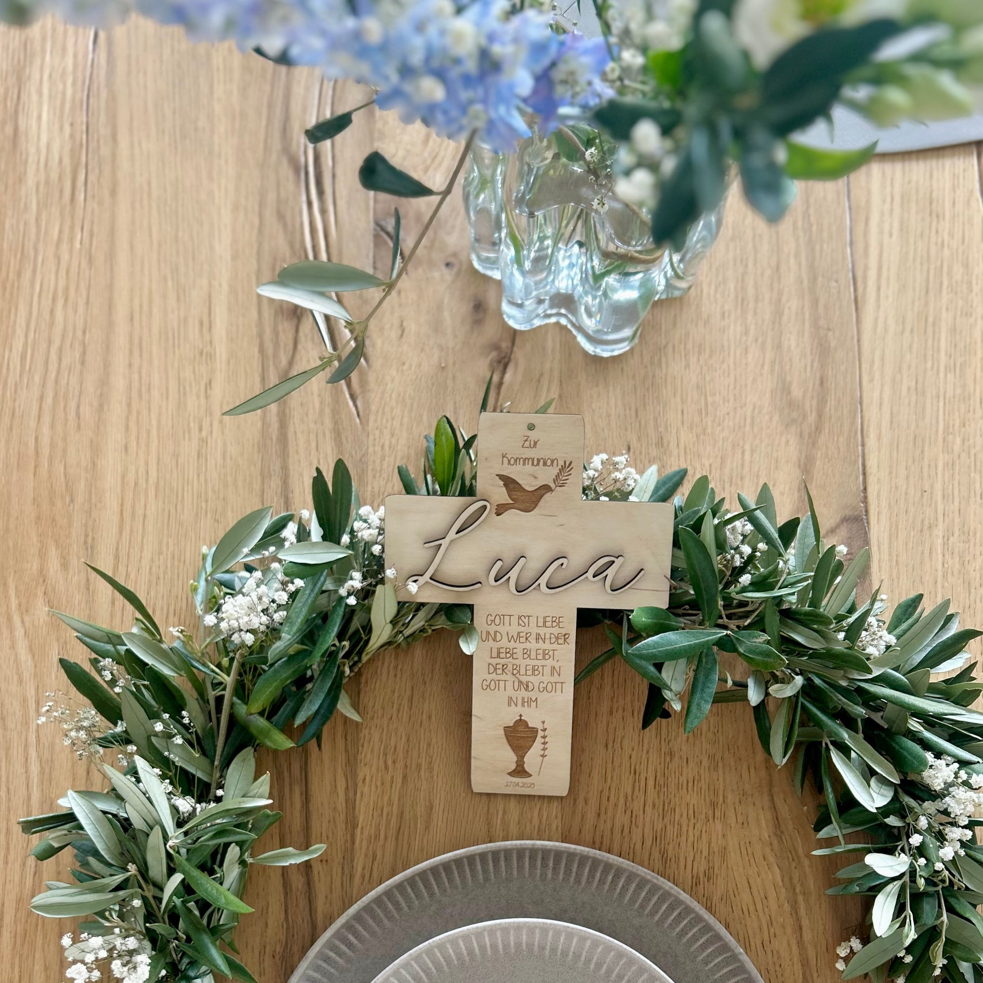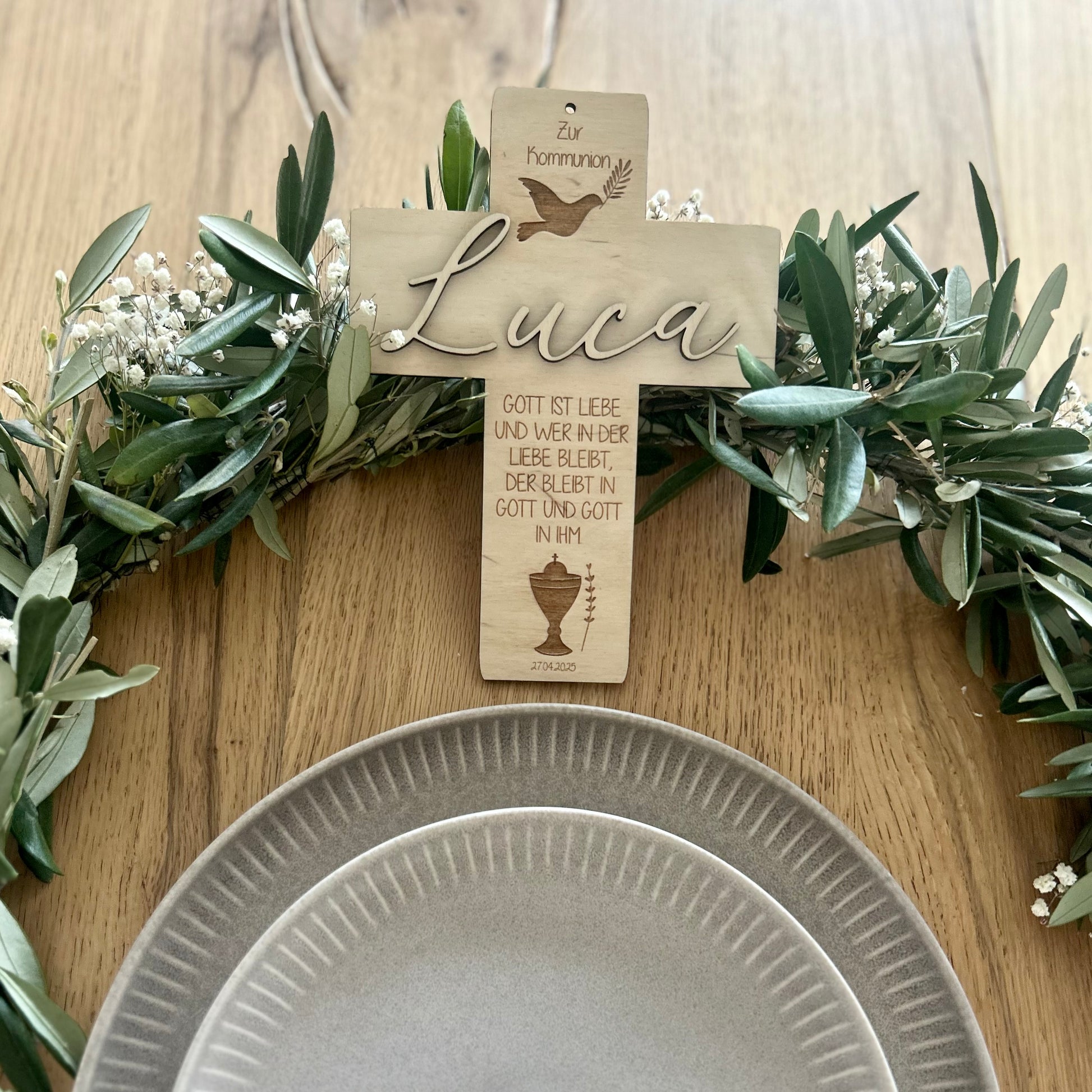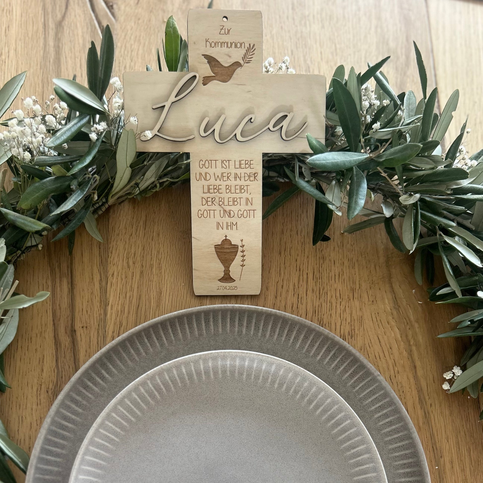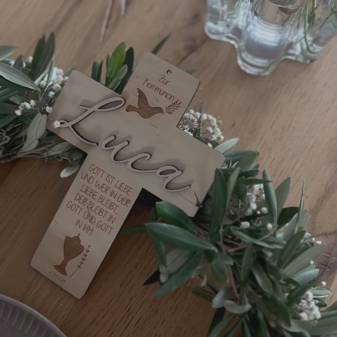 Personalisiertes Kommunionskreuz mit Name, Datum & Wunschspruch