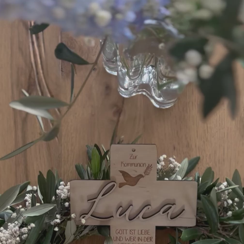 Auf Wunsch personalisieren wir das Kreuz mit dem Namen des Kindes, dem Kommunionsdatum und einem Wunschspruch. So entsteht ein ganz persönliches Geschenk, das im Kinderzimmer oder Zuhause einen besonderen Platz findet.